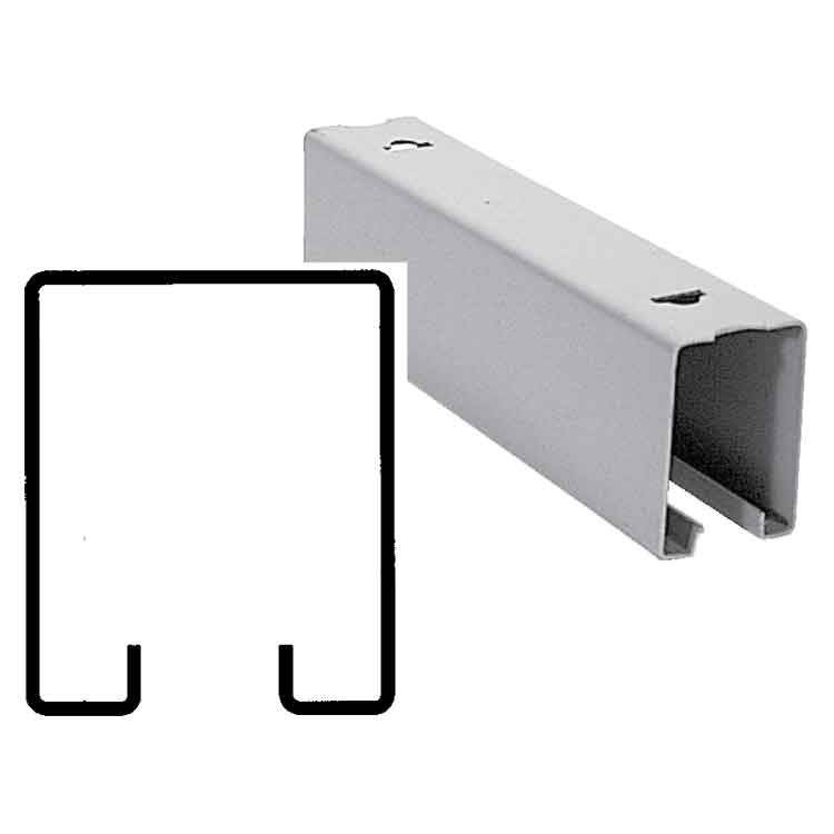 Box track is a top hung system, where the track is mounted over an opening. Door panels are outfitted with hanger assemblies that ride in the enclosed track. The track is attached to the building by brackets. These brackets give the track stability and strength and prevent the enclosed track from opening up over time. The weight of the door is supported only by the track system. A bottom guide/roller is used to stabilize the bottom of the door.