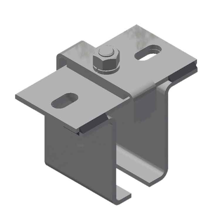 Similar to a cross ear center bracket with the exception of the joint clip. The joint clip helps mate two sections of track together forming a single run. Joint brackets nullify the need to weld tracks together. This style of bracket also prevents track creep in multiple-piece track applications.