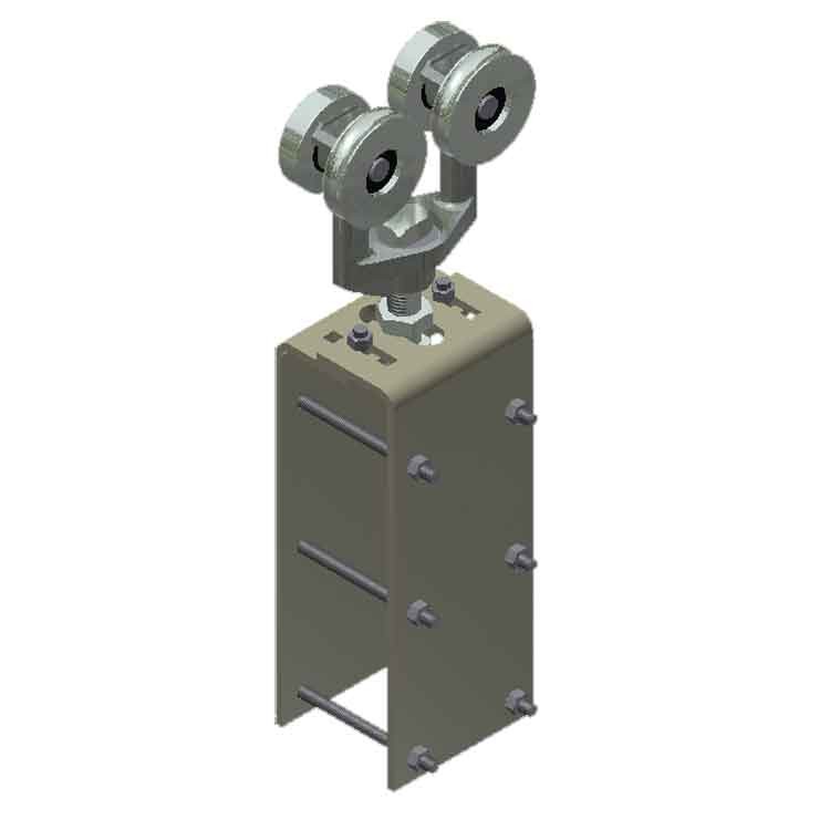 Sometimes called a trolley assembly, a Hanger assembly is made of three components. The first is the wheel assembly called a truck. The second is an adjustable bolt called a pendant bolt. The last component is the apron assembly which comprises of two metal plates that wrap around the top of the door. Bolts are secured perpendicular through the door and into these plates.