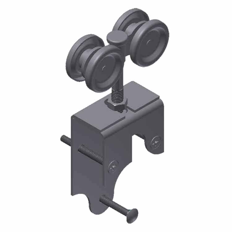The trucks (rollers) are attached to the door by a pair of metal aprons that wrap around the top of the door and are through bolted through the door. Allows for vertical and lateral adjustment of the door in relationship to the track.