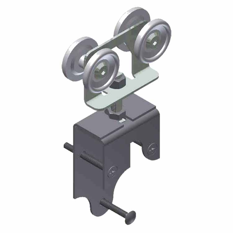 The trucks (rollers) are attached to the door by a pair of metal aprons that wrap around the top of the door and are through bolted through the door. Allows for vertical and lateral adjustment of the door in relationship to the track.