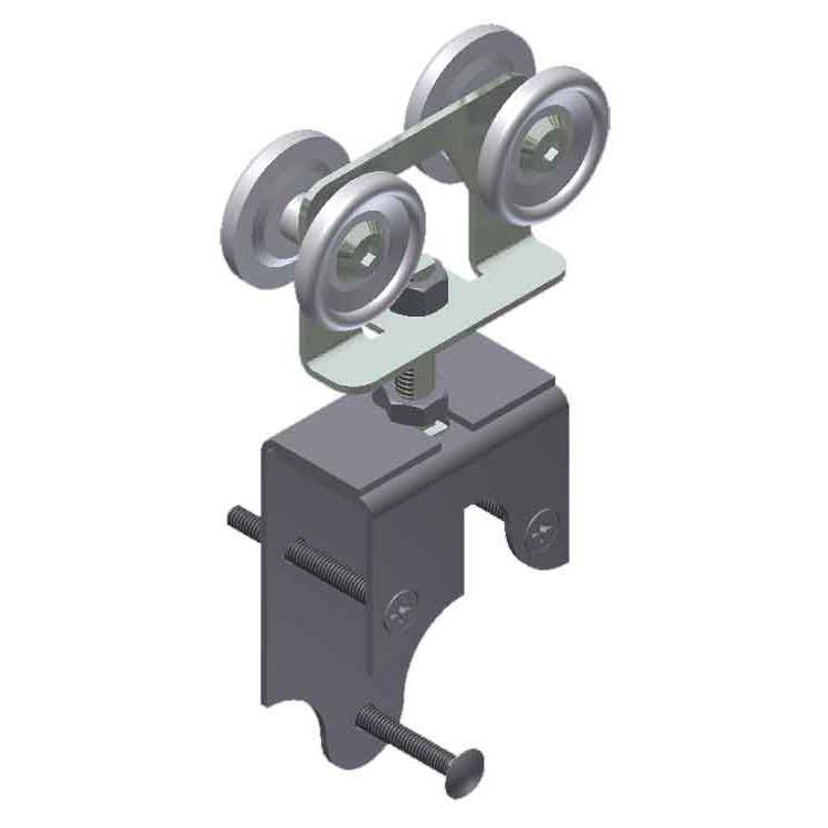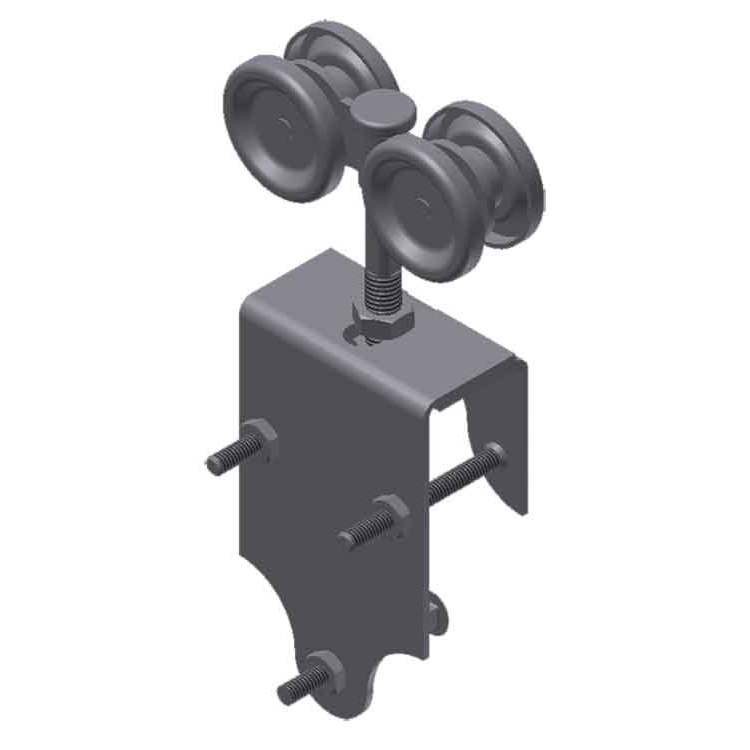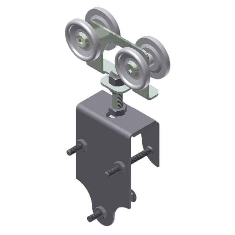 The trucks (rollers) are attached to the door by a pair of metal aprons that wrap around the top of the door and are through bolted through the door. Allows for vertical and lateral adjustment of the door in relationship to the track.
