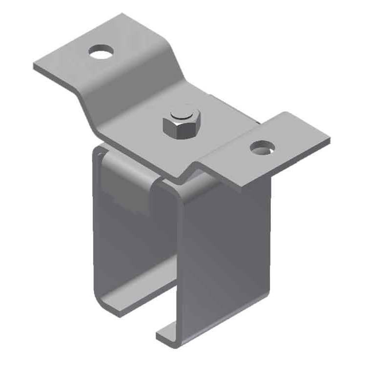 Similar to a cross ear center bracket with the exception of the joint clip. The joint clip helps mate two sections of track together forming a single run. Joint brackets nullify the need to weld tracks together. This style of bracket also prevents track creep in multiple-piece track applications.
